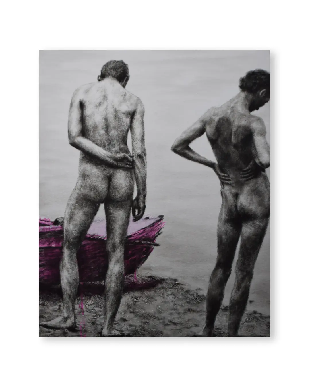Cuando pesa el silencio es una pintura al óleo con intervención de color sobre lienzo (61 × 50 cm), realizada por Yohan Pixone en 2026. La obra forma parte de la serie Cuerpos en suspensión, una investigación centrada en la figura humana como espacio de presencia, tensión y deseo contenido.