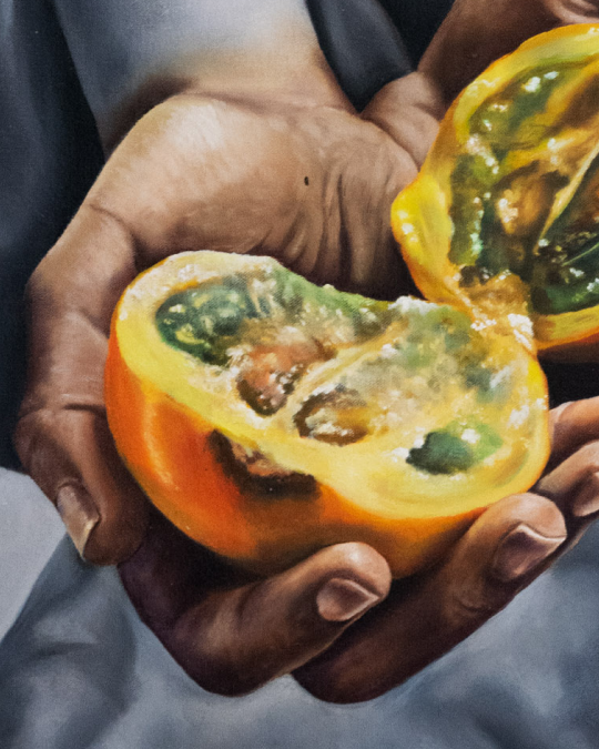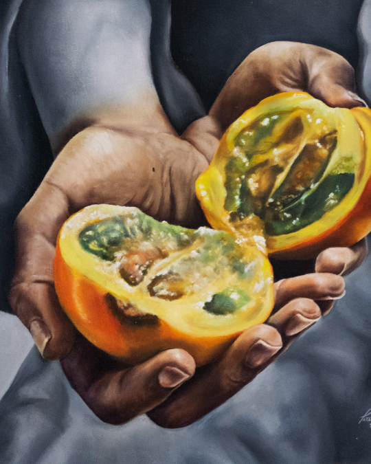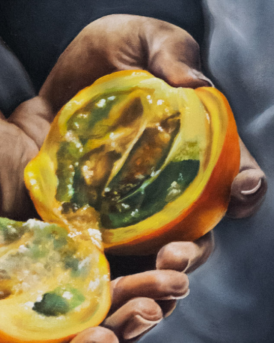 El uso del hiperrealismo en los detalles del fruto —desde sus tonos verdes, amarillos y naranjas hasta su pulpa jugosa— invita al espectador a sentir la frescura, como si pudiera extender la mano y tocar su superficie. El fondo oscuro hace resaltar los colores cálidos y vibrantes, guiando la mirada hacia el centro emocional de la obra: la simbiosis entre la mujer y la fruta.