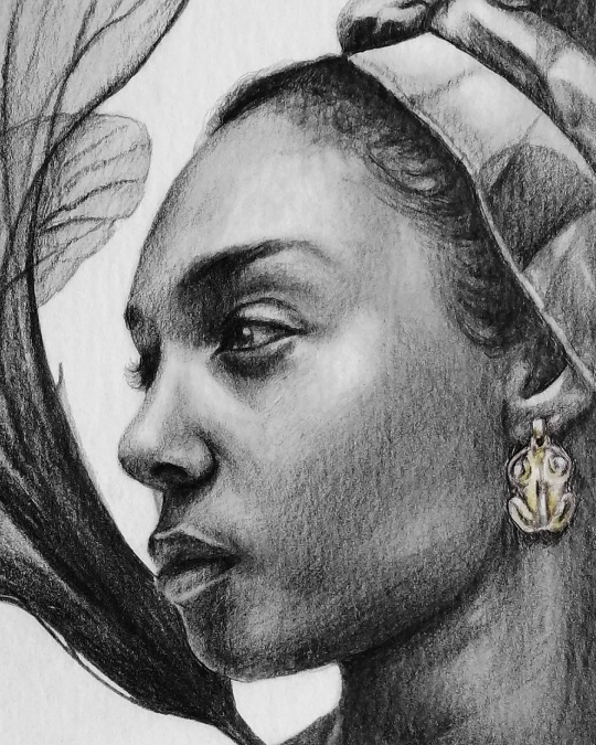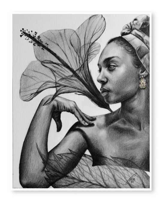 Retrato a mano en grafito sobre opalina que muestra a una mujer afrodescendiente con una flor emergente como símbolo de poder, espiritualidad y conexión con la tierra. Parte de la colección Evano ~ Colores del Caribe.