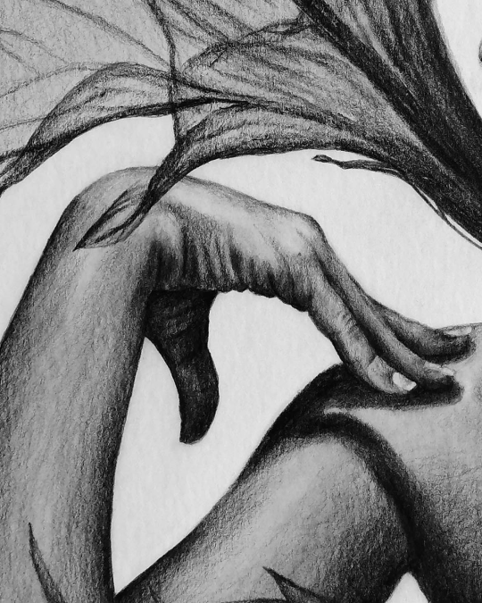 La técnica del grafito en este retrato a mano permite matices de sombra, profundidad emocional y textura que realzan cada detalle de la escena: el brillo suave en los ojos, la delicadeza de la piel, y la fluidez de la flor. Todo esto se enmarca en un fondo blanco puro, que concentra la atención del espectador y transforma la obra en un instante meditativo.